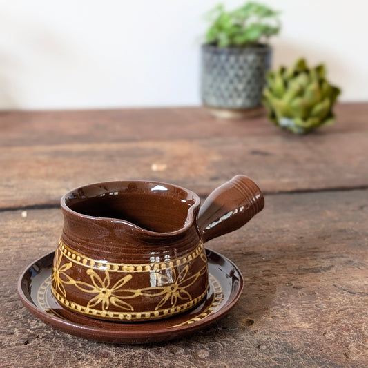 Brown Slipware Ceramic Sauce Pot and Saucer