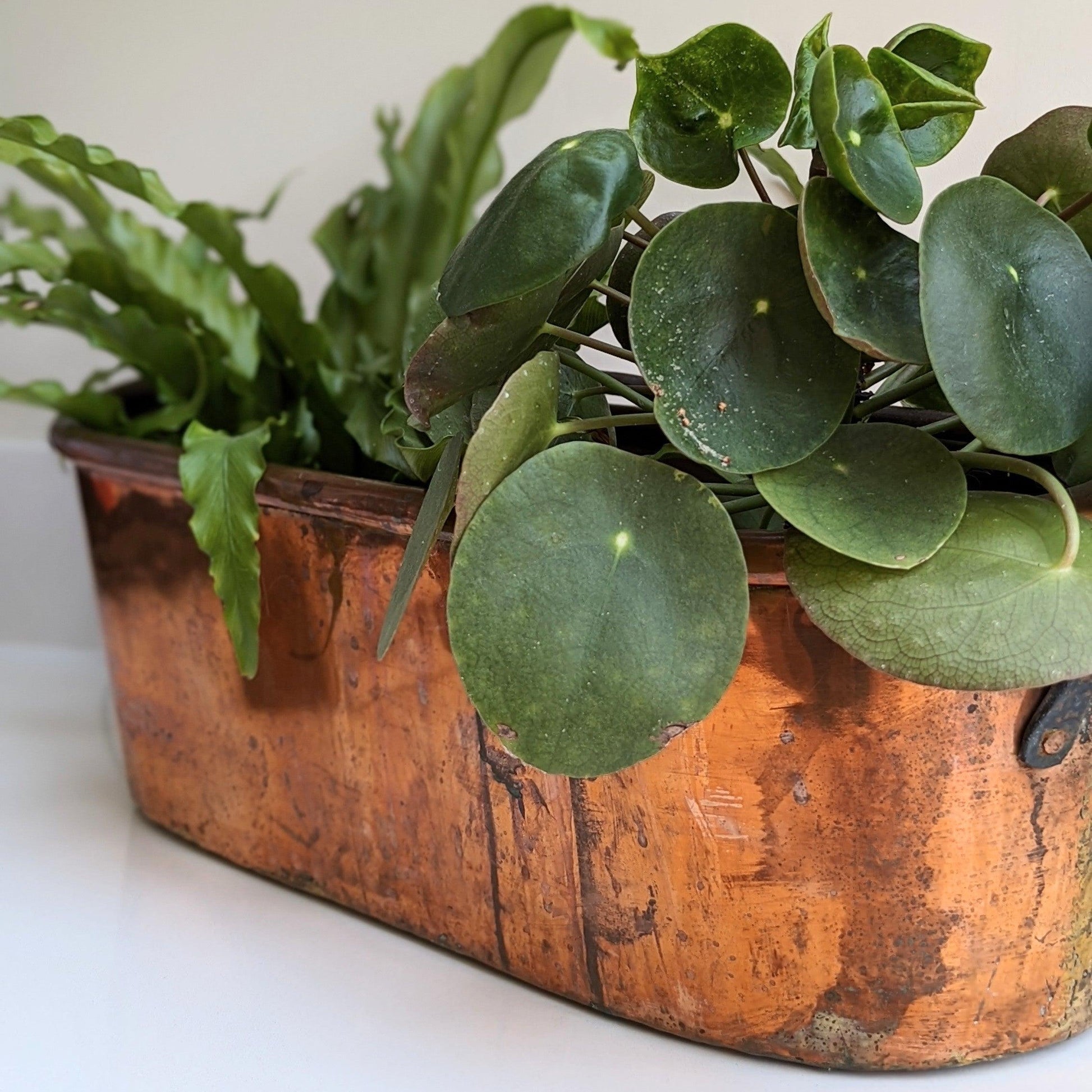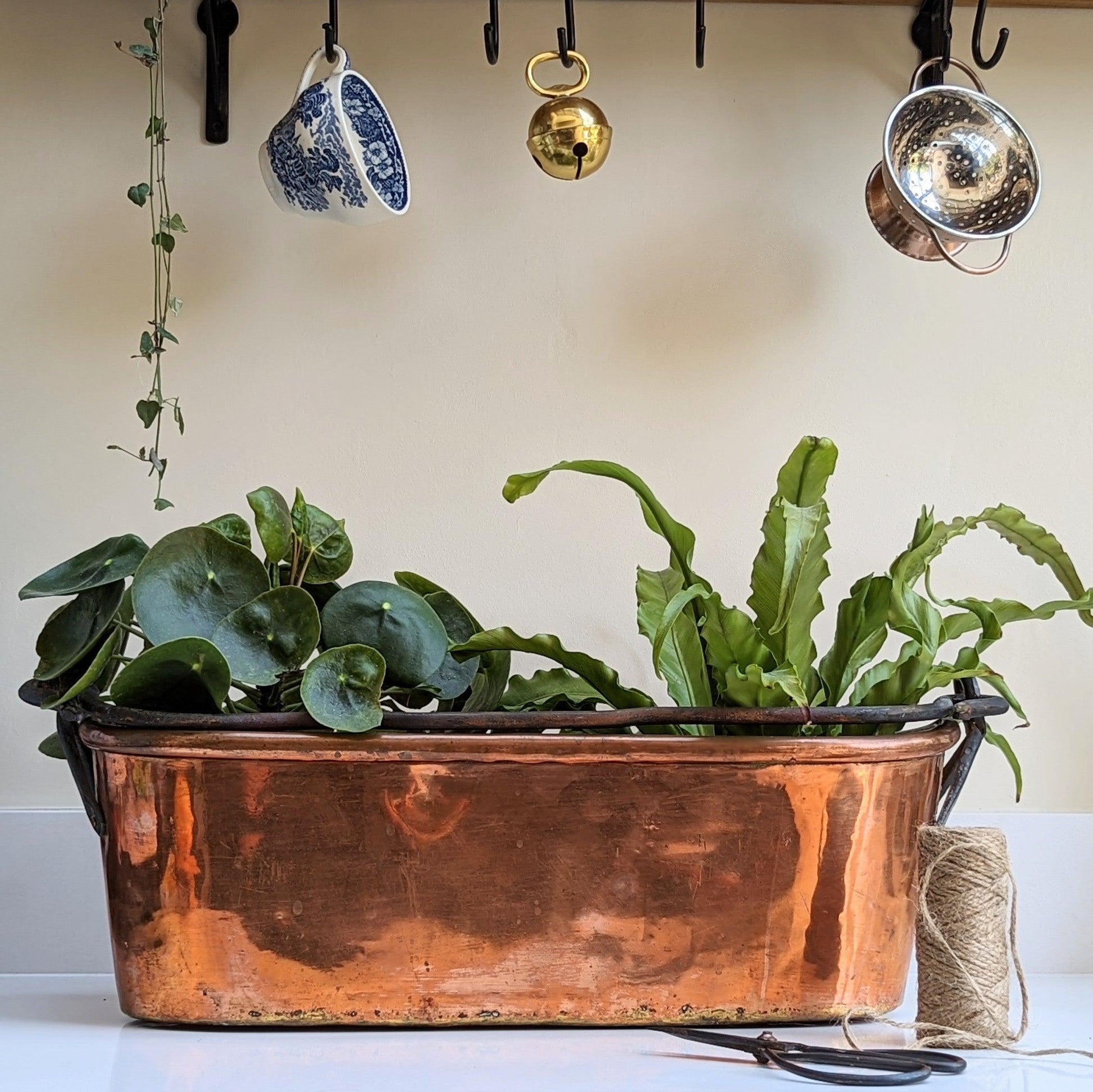 An artisan-made old French copper fish kettle/poissonnière with iron handle and rolled rim. This heritage cookware item can still be used for make for popular decorative items - for planting up with flowers, indoor plants or herbs.