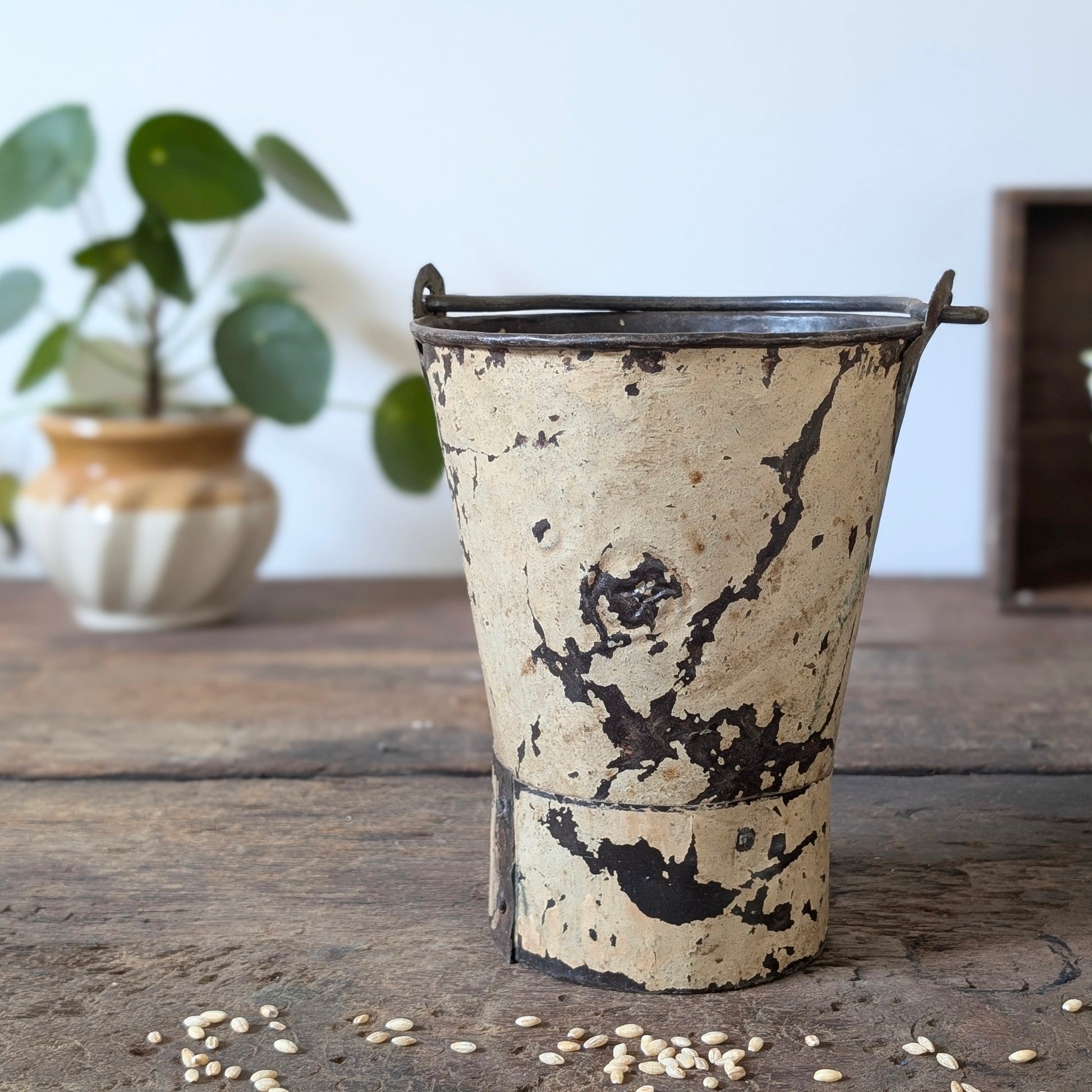 Add rustic charm to your space with this reclaimed Indian metal bucket, rich in age marks and chippy paint. Perfect as a planter for flowers or herbs, or styled indoors holding sponges, brushes, or kitchen utensils.