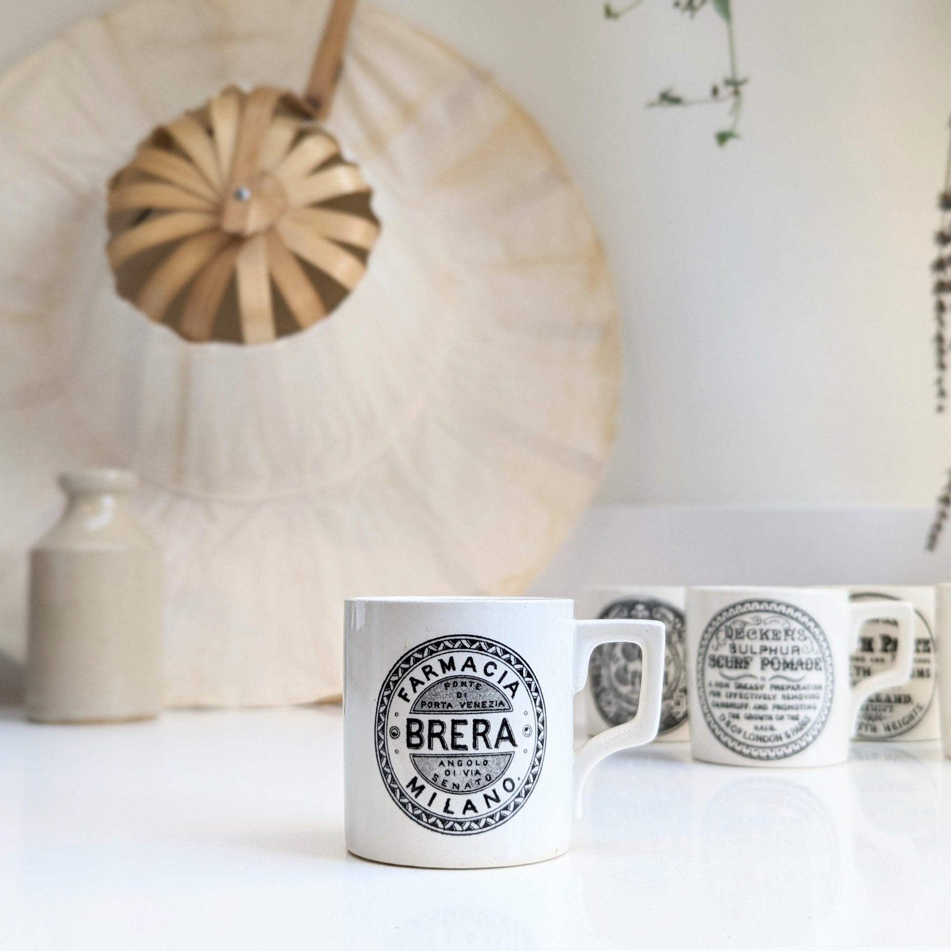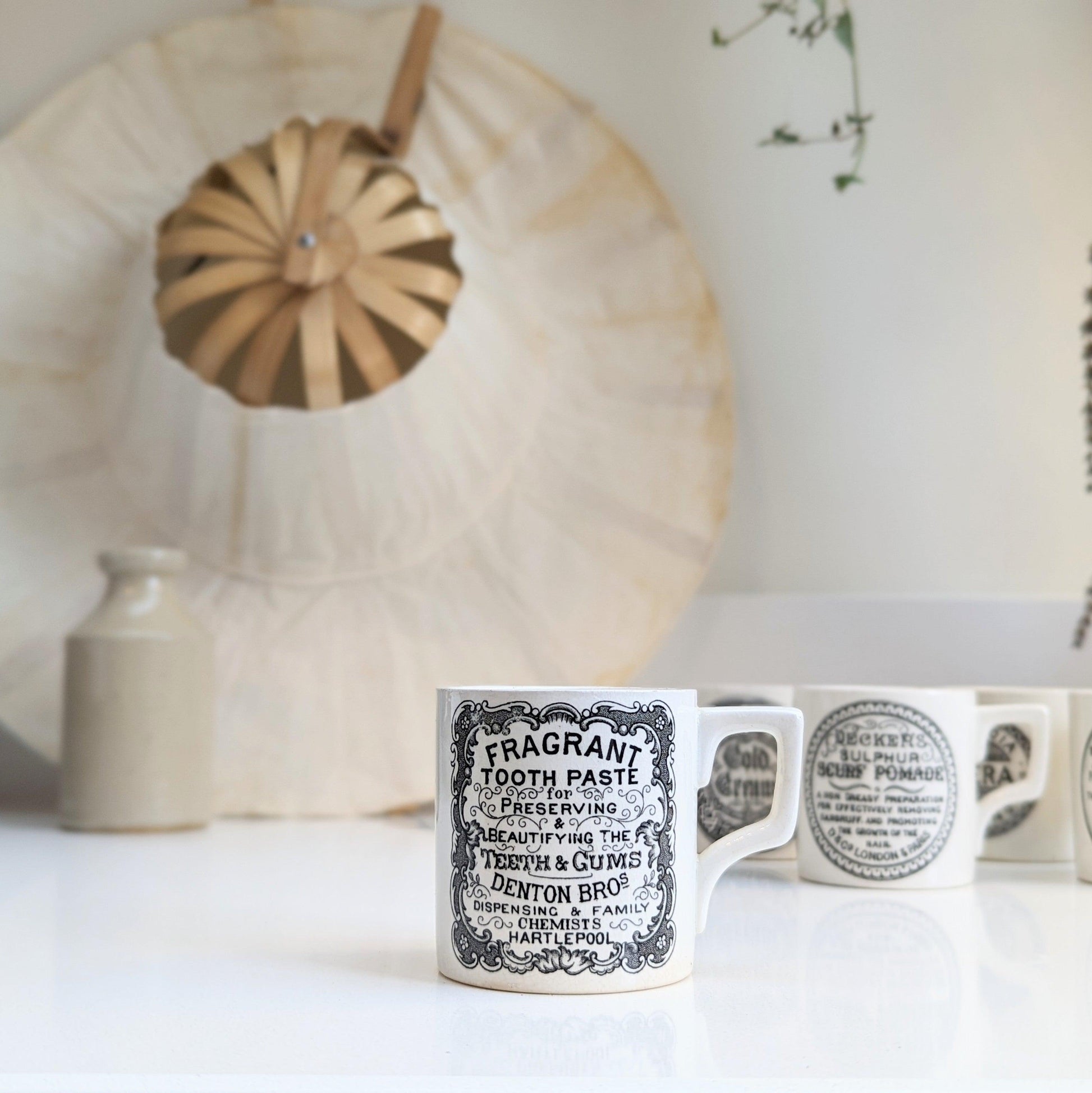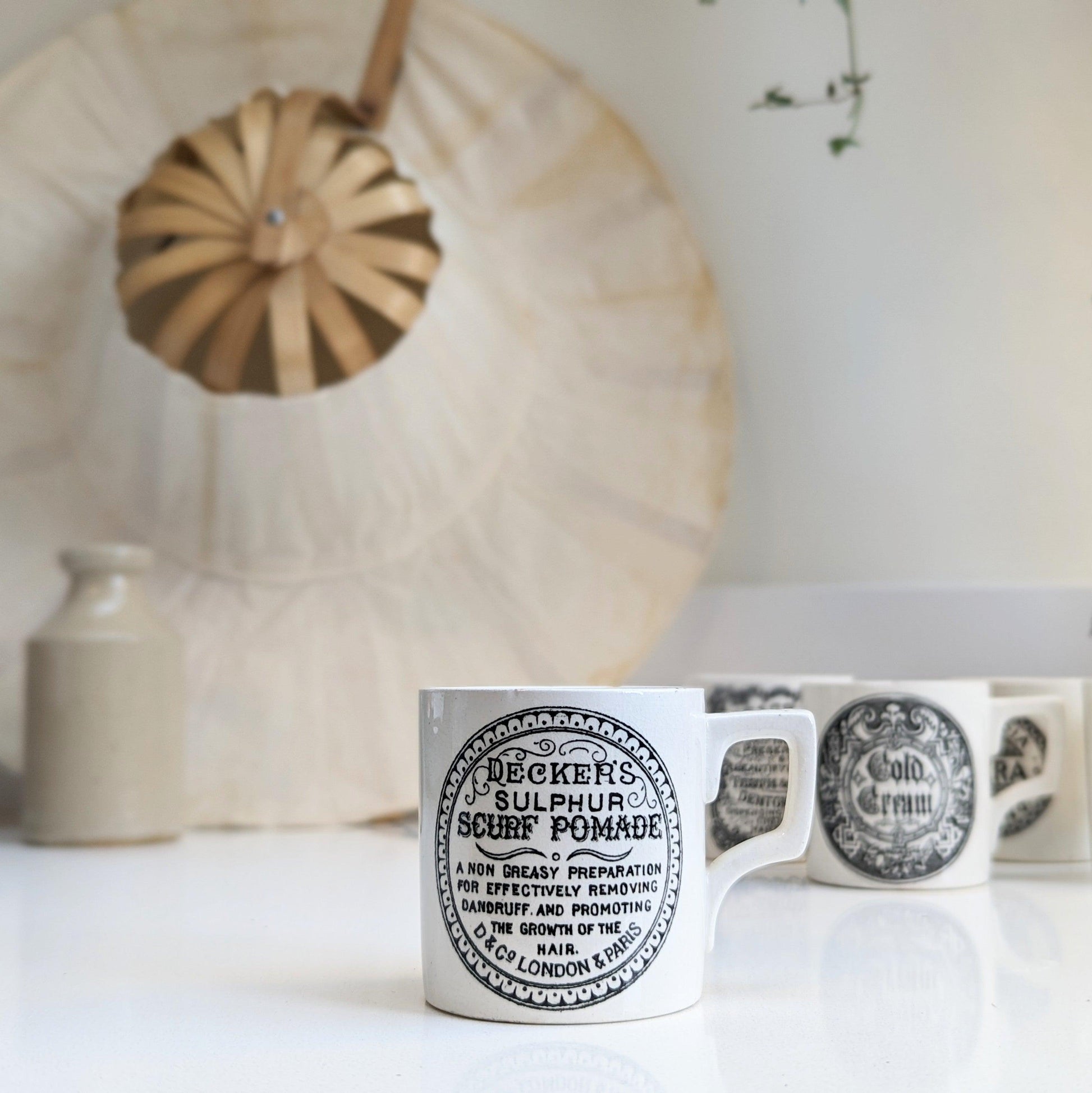 The 'Chemist Prints' range of pottery ware started life being called 'Medicine Prints' back in 1962. Susan Williams-Ellis re-used the nineteenth century copper plates that she inherited when she bought Kirkham's and remade the pharmaceutical and medical prints and labels to decorate her pottery ware. The bizarre range of slogans and adverts included 'Horne's Odontoline toothpaste', 'Deckers Sulphur Scurf Pomade ', 'Universities Toilet Club', 'Cold Cream' and 'Superior Potted Yarmouth Bloaters'.
