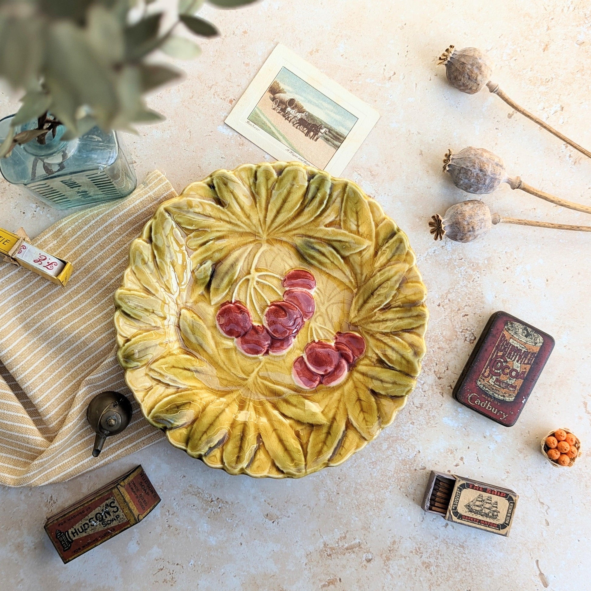 I love a fruit themed plate and these French Sarreguemines plates are just prime example of majolica design. A cherry plate and pear plate feature in this pair.