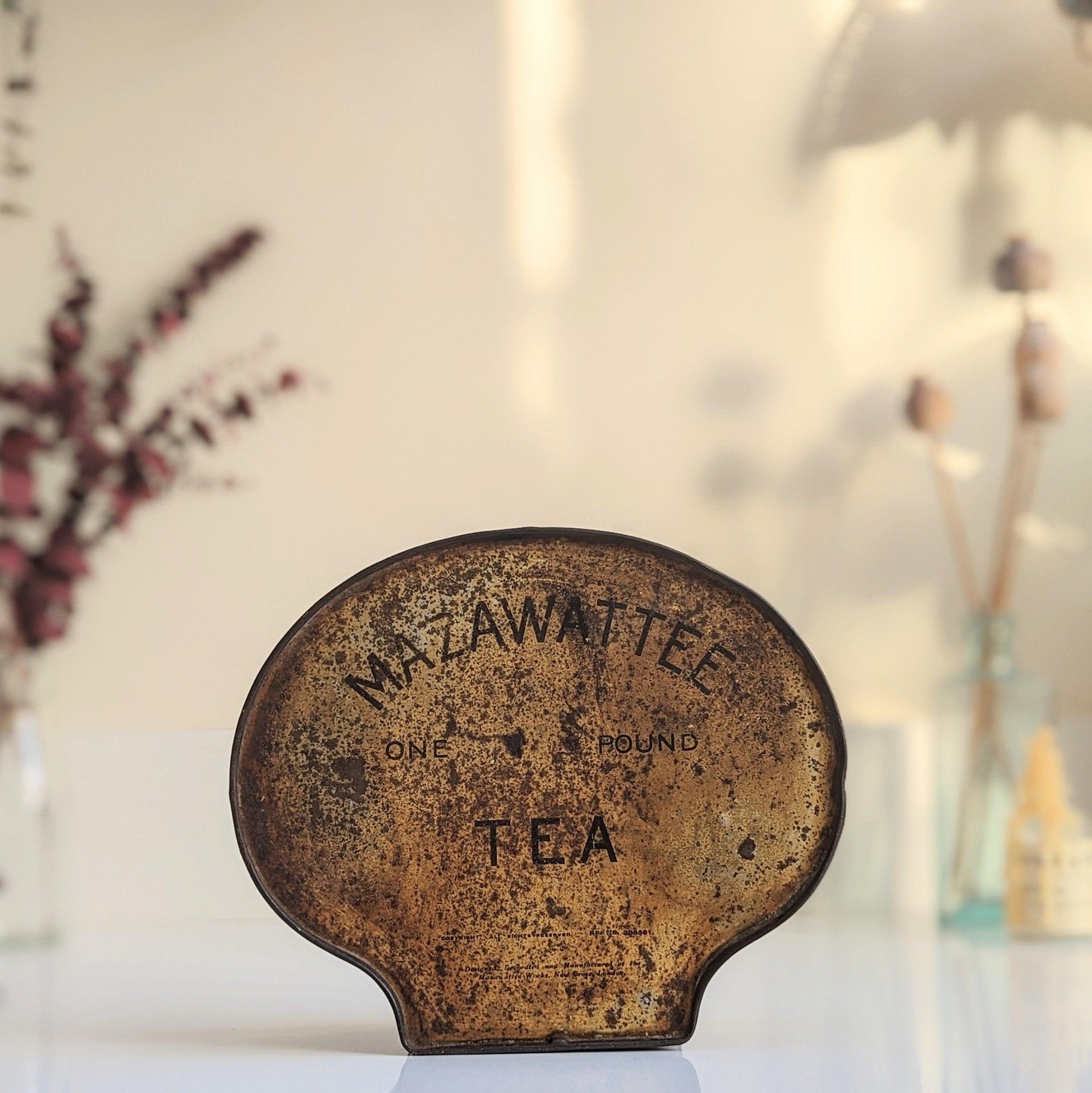 This rare and beautiful antique tea tin from Mazawattee of England is shaped like a shell with embossed details, with smaller shells decorating around the base. I understand this vintage tin box dates to around 1900.