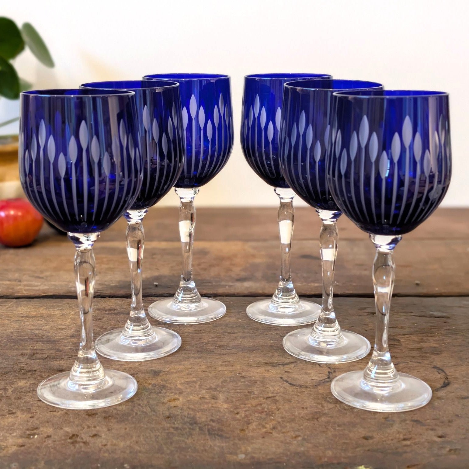 Six dazzling blue-flashed wine glasses: bold colour, crisp cuts, all charm.