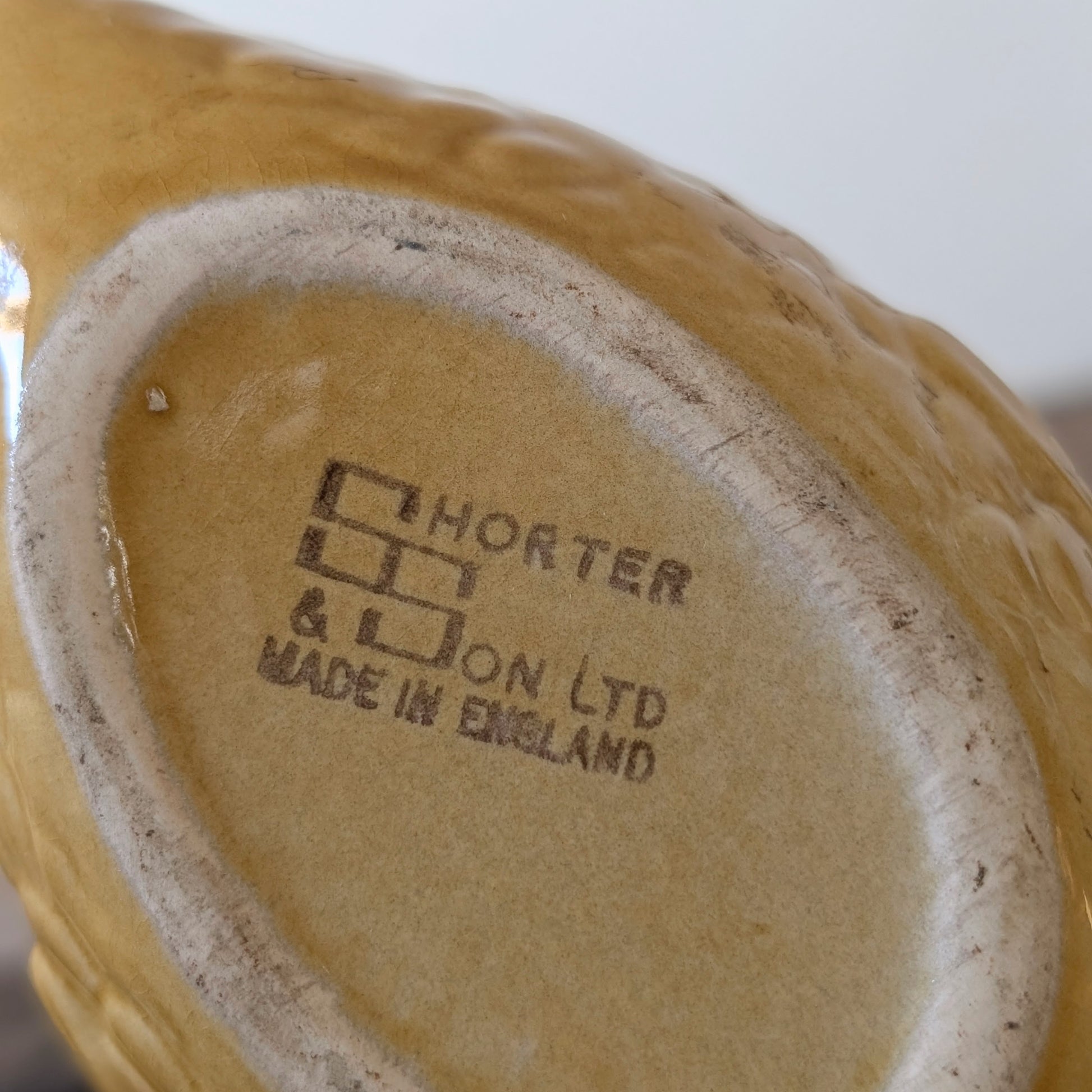 Quirky fish jug made in the UK by Shorter and Sons. Finished in a warm yellow/mustard colour. Originally this jug would likely have been rested on a fish shaped saucer but it no longer has this.