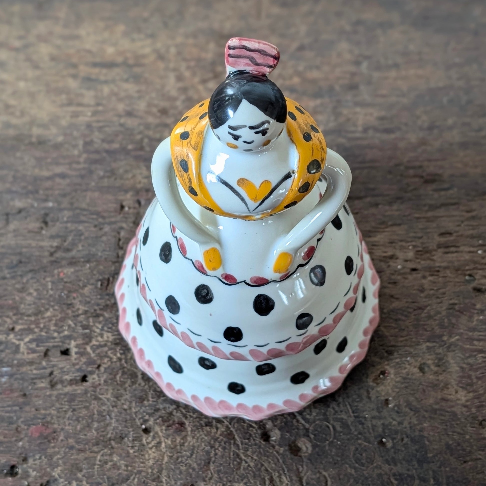 A lovely Spanish ceramic bell from Fraile P.A.R., shaped as a woman in traditional dress. Decorative, slightly quirky, and full of regional charm. Just as nice placed where it can actually be rung as it is displayed as a small folk-art piece with a bit of soul.