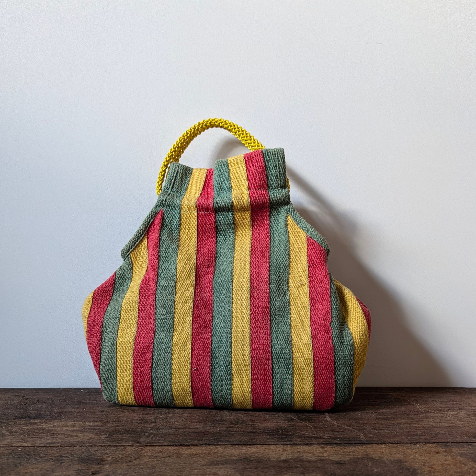 This striped vintage knit bag is pure retro goodness. With its bold green, red, and yellow stripes, it’s the kind of piece that instantly adds a pop of colour and personality. Whether you’re throwing in your daily essentials or taking it on a weekend wander, it’s got that effortlessly cool, well-loved vintage feel.